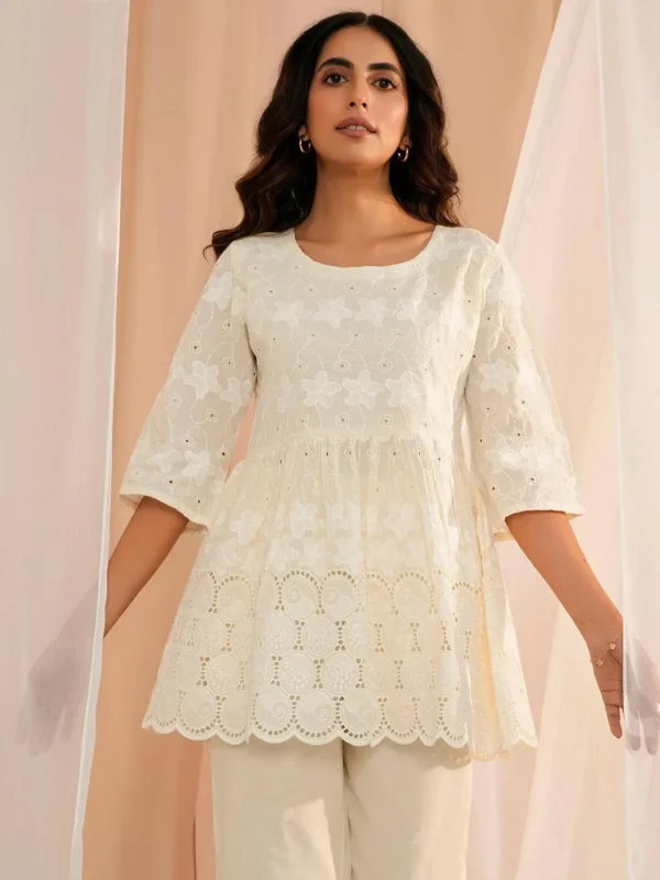 Zoya Off White Embroidered Cotton A-Line Kurti